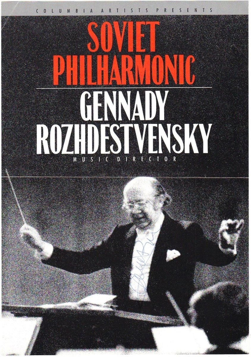 Signed promo booklet for a concert at Carnegie Hall, 1992. 1 page. Signed on both sides, front by conductor Rozhdestvensky (signature is over his chest), back by pianist Viktoria Postnikova. Size is 7 x 10 inches, central fold, in good condition.