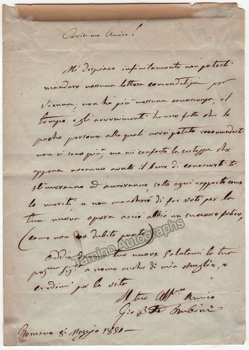 Rubini, Giovanni Battista - Autograph Letter Signed - Tamino Rubini, Giovanni Battista - Autograph Letter Signed - Tamino