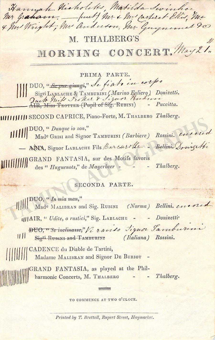 Original vintage (unsigned) program for a concert in London in the 1830s featuring some of the famous artists of the time including Giovanni Batista Rubini, Maria Malibran, Luigi Lablache, Antonio Tamburini, Sigismond Thalberg, and Charles De Beriot.