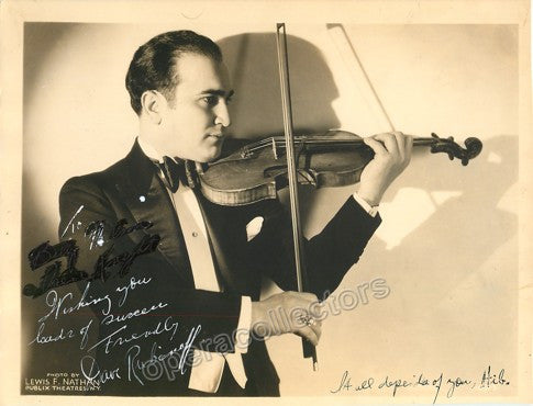 Belarusian violinist (1897-1986), famous for performing popular music on radio programs, theaters, clubs and schools. He also conducted his own orchestra and show on NBC radio and appeared on films. Signed photo, 10 x 8 inches, on double weight photo paper. Somehow it was originally inscribed in white ink but the name has been hidden by black in. Text in white ink reads "Wishing you loads of success. Friendly," and Rubinoff´s signature. In excellent condition