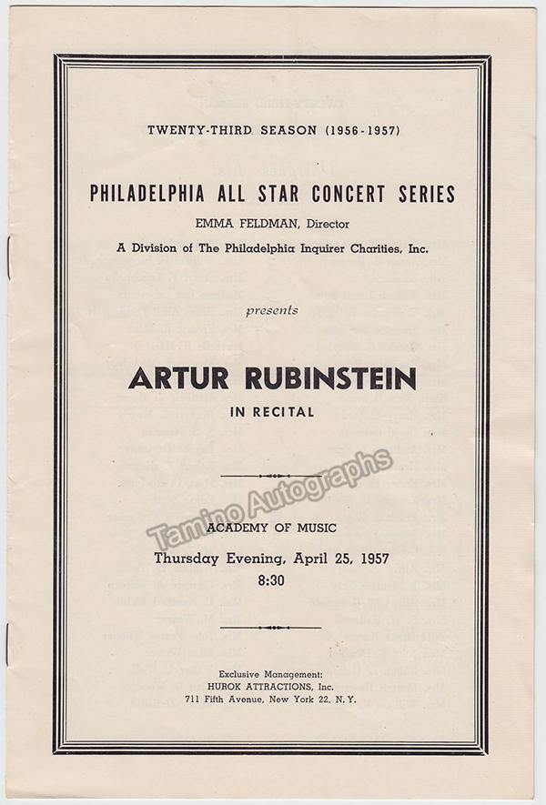 Complete program for a performance of the star Polish-American pianist at the Philadelphia Academy of Music on April 25th, 1957.  Size is 6 x 9 inches, 4 pages + covers, in excellent condition.