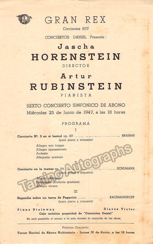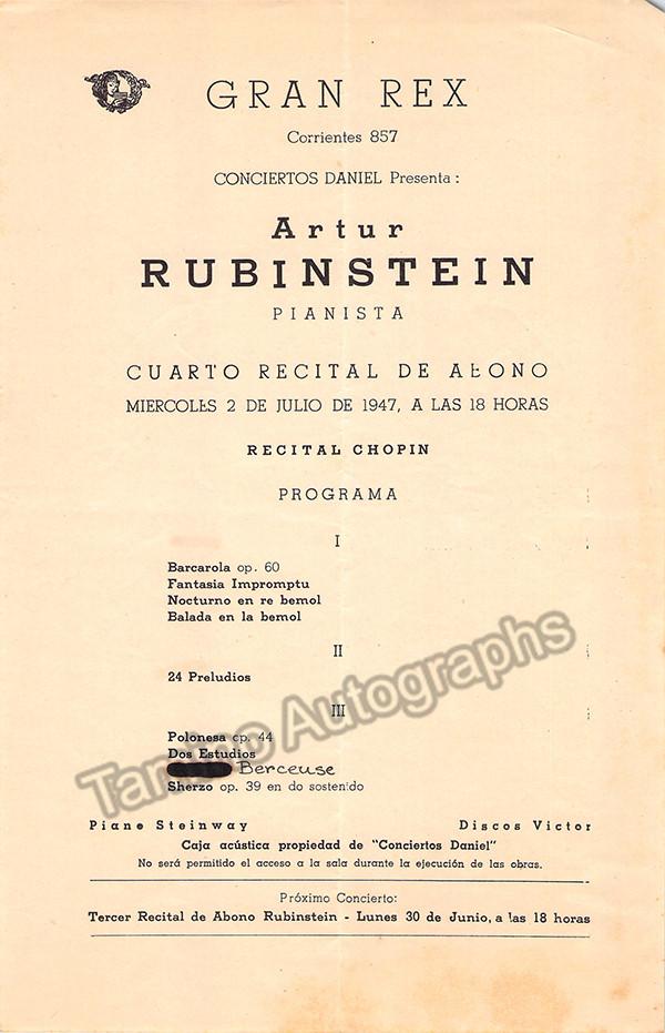 Lot of 4 1-page concert programs for recitals by Artur Rubinstein at Teatro Gran Rex, Buenos Aires, Argentina, during his visit in 1947. Each one sized 6 x 9 inches, very good condition- Rare!
