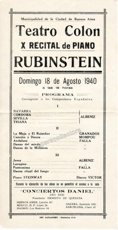 Playbill announcement for a concert by Rubinstein at Teatro Colón, 1940. In excellent condition