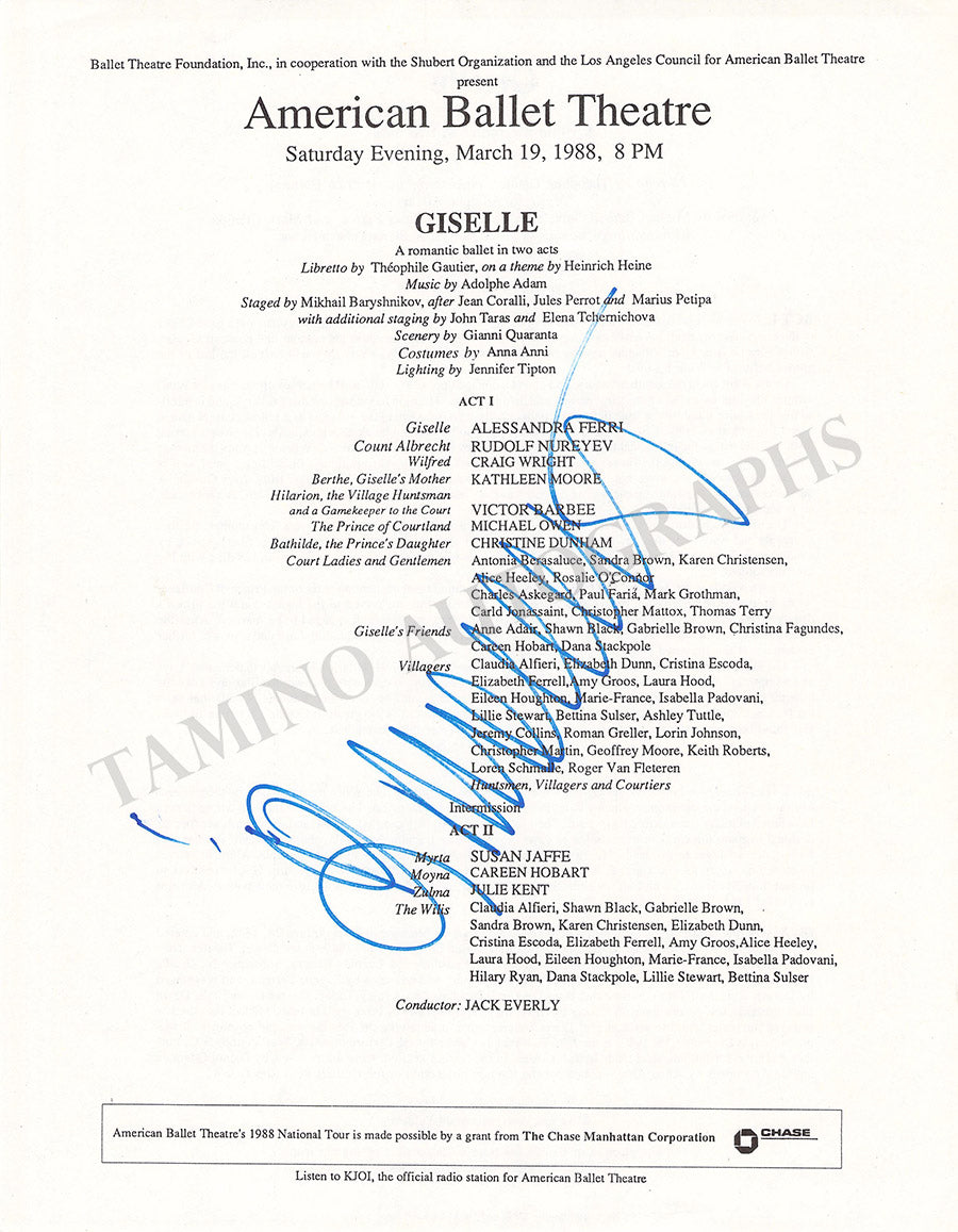 Cast page for a performance of "Giselle" on March 19, 1988, featuring the star ballet dancer at the American Ballet Theater, signed by him. Size is 8.5 x 10.9 inches, in excellent condition.