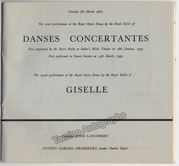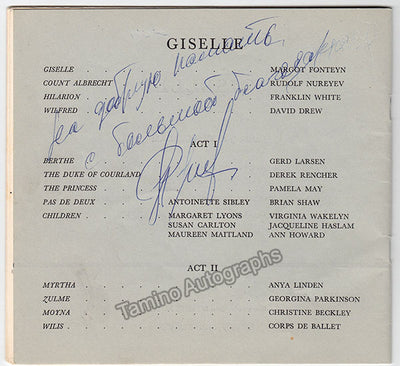 Original program for a performance of Adam's ballet Giselle at The Royal Ballet, Covent Garden on March 6th, 1962, signed by Nureyev. Size is 7.25 x 6.75 inches, full program with all pages and covers, in excellent condition.