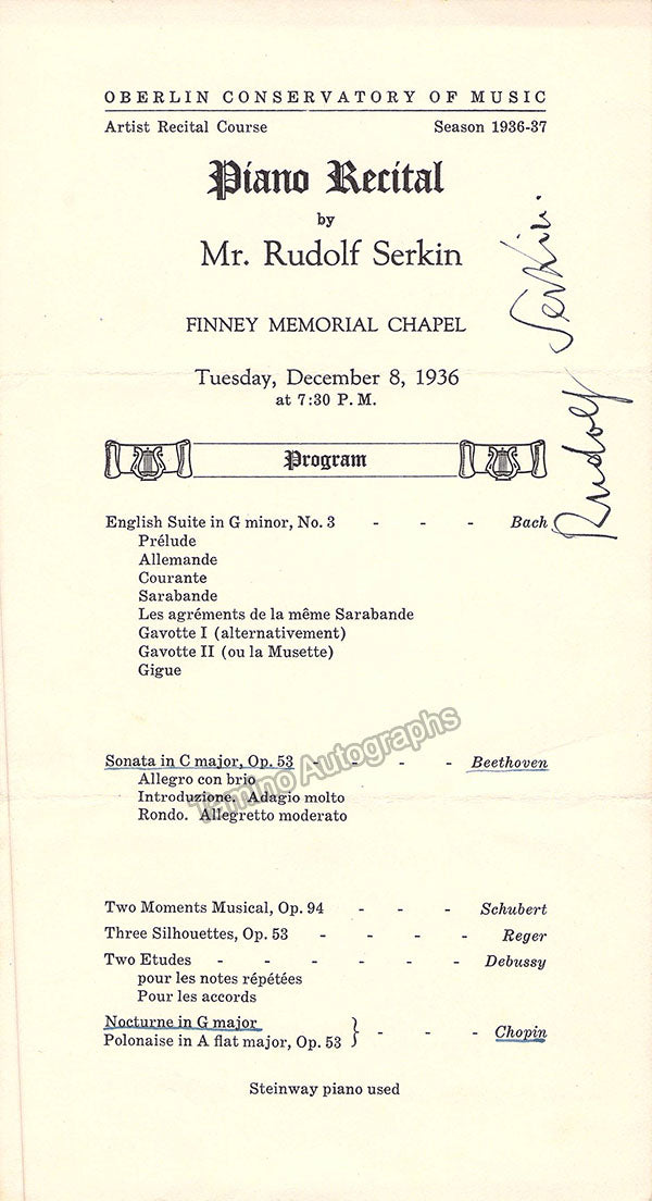 Program for a recital of the famed Austrian-American pianist in Oberlin, Ohio, USA, on December 8th, 1936, signed by him over the upper-right corner. Size is 4.9 x 9 inches, 1 page, folds, in very good condition.