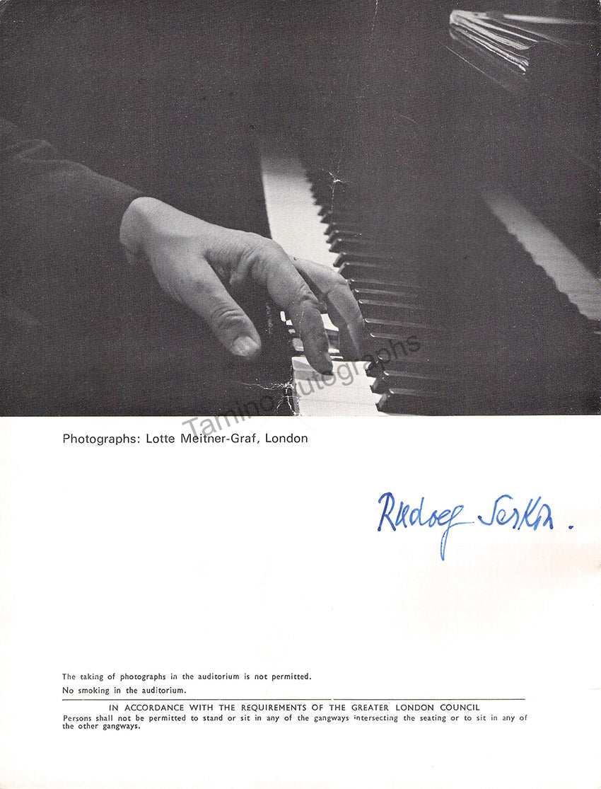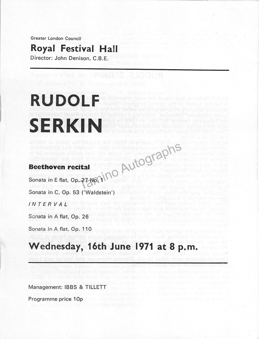 Program for a recital of the American pianist at the Royal Festival Hall, London, on June 16th, 1971, signed by the soloist on the front cover.