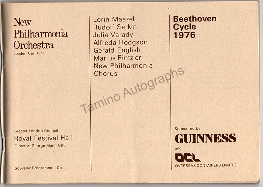 Program for a performance of the American pianist with the New Philharmonia Orchestra conducted by Lorin Maazel, at the Royal Festival Hall, London, 1976, signed by the pianist on his photo page.