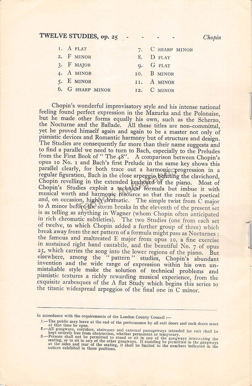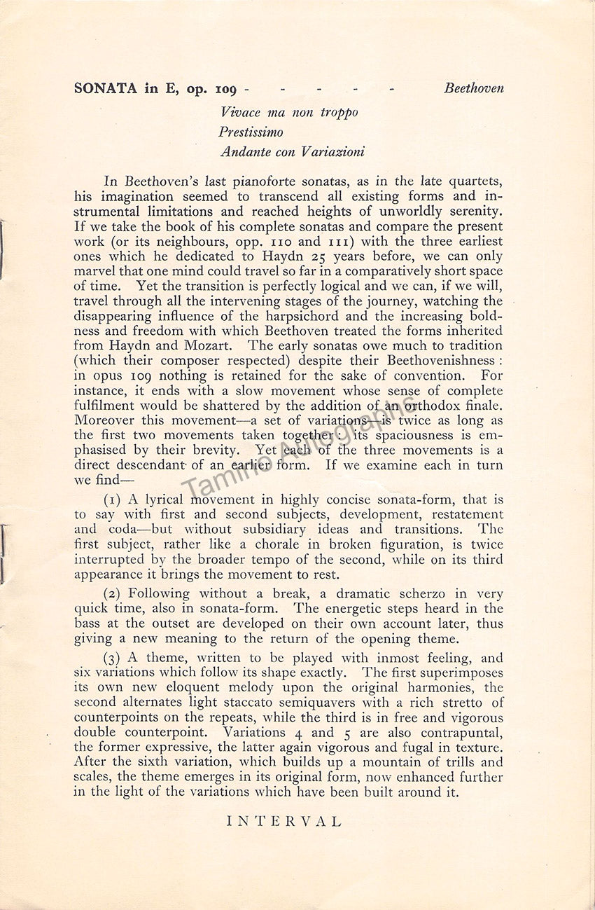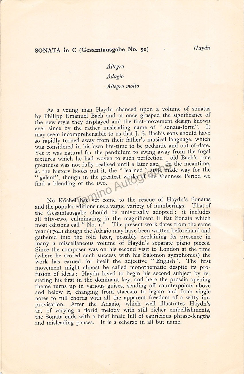 Page for a program for an All-Beethoven piano recital by the star pianist at The Royal Opera House, Covent Garden (no date indicated) signed by him on the back of the program page.