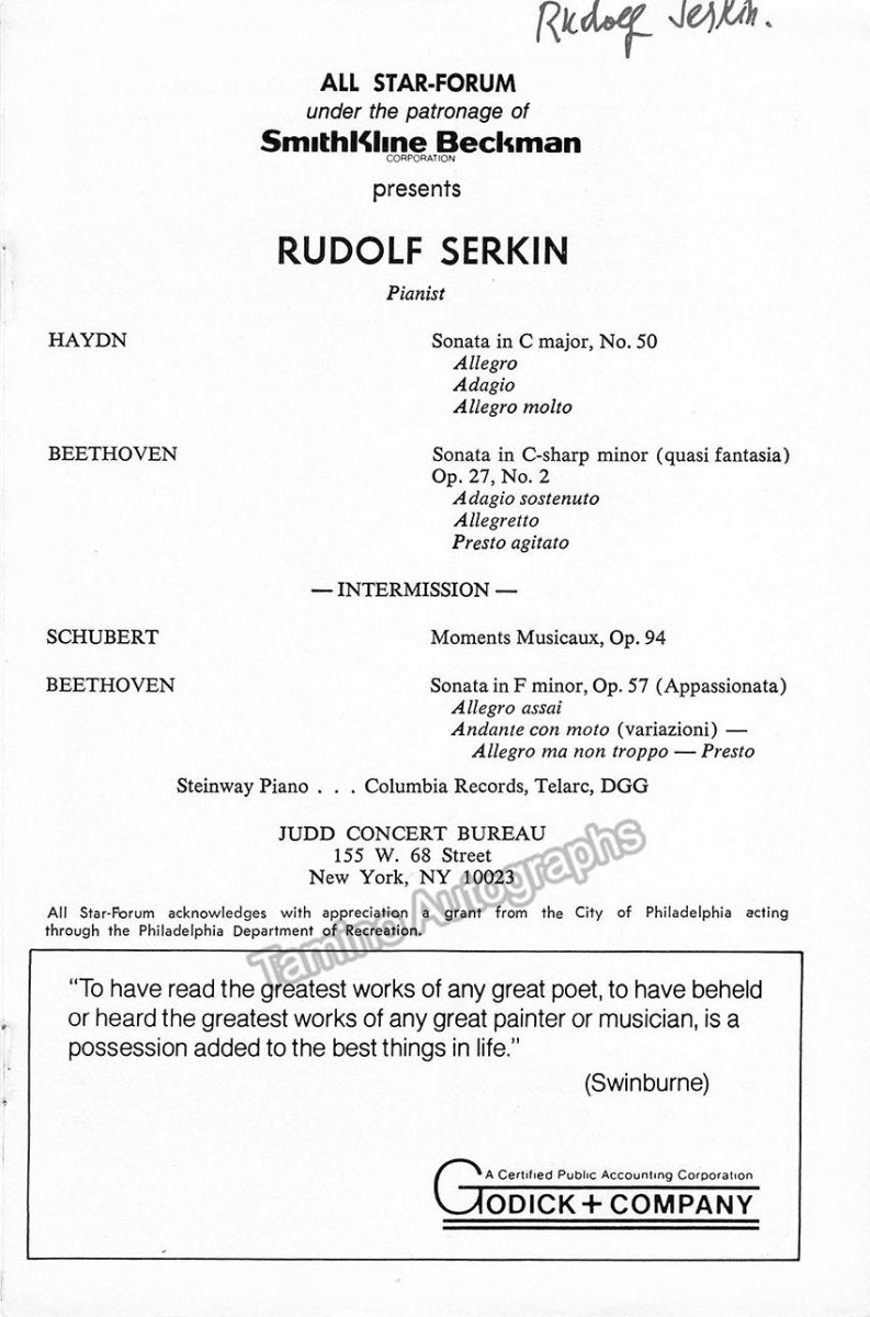 Program for a recital of the celebrated pianist at Carnegie Hall, New York, December 1976, signed by him with a short sentiment, performing Beethoven's Piano Concertos No.2 & No.4 with the Philadelphia Orchestra under Eugene Ormandy.