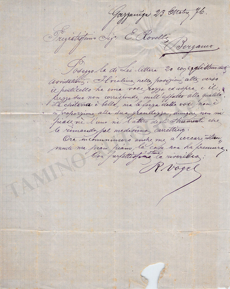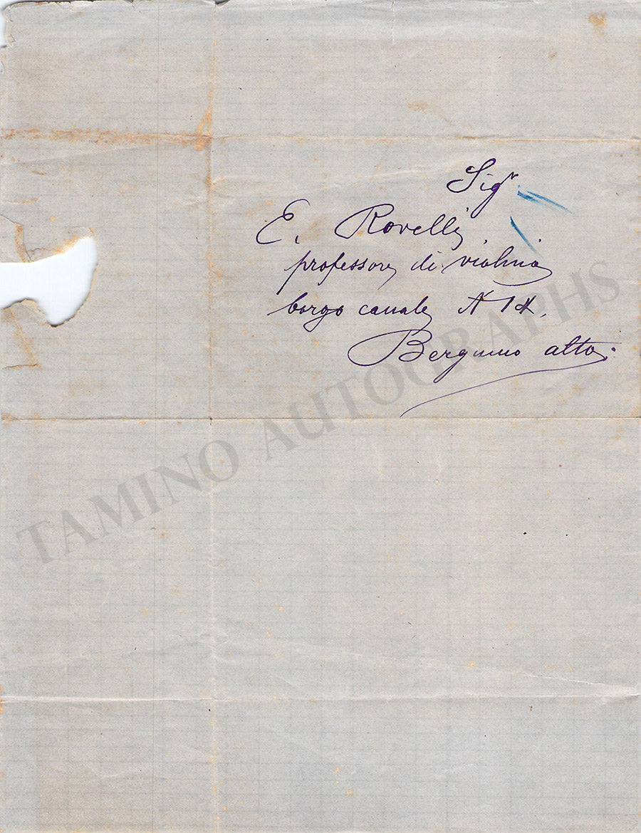 Autograph letter in Italian signed by him, dated October 23, 1876, to violinist Emanuele Rovelli (1836-1912), son of the composer Pietro (1793-1838), sending back a violin and a guitar, which he bought from him.