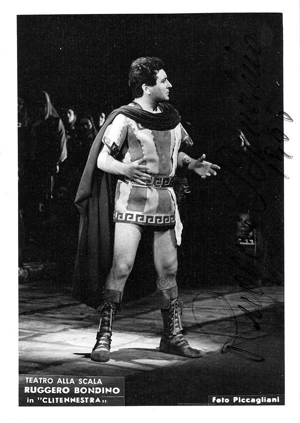 Italian tenor (b.1930), signed photo, shown as Orestes in world premiere production of Idlebrando Pizzetti's opera Clitennestra at La Scala, Milan. Printed signature on front by photographer Piccagliani, Milan. Size is 4 x 5.75 inches, in excellent condition.