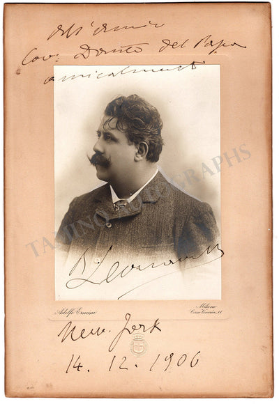 Beautiful black-and-white photograph mounted on a photographer mat by photographer Adolfo Ermini, signed by the composer and dated in New York, 1906. Total size is 6.75 x 9.8 inches, some rust over the borders, mounting traces on verso, in overall very good condition.