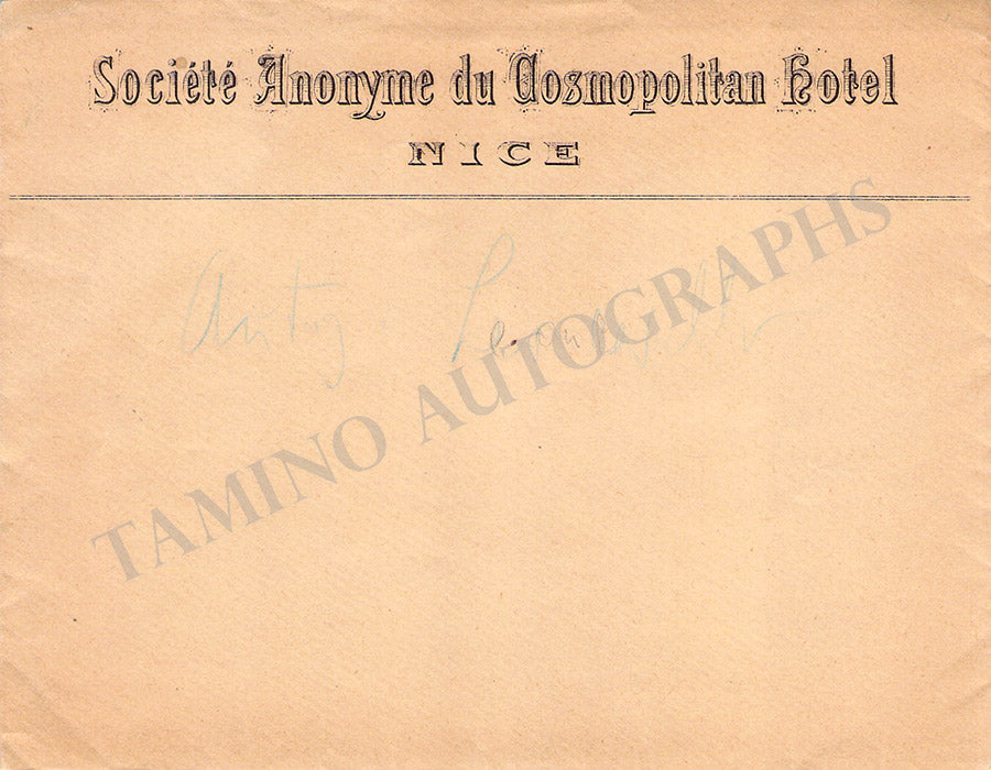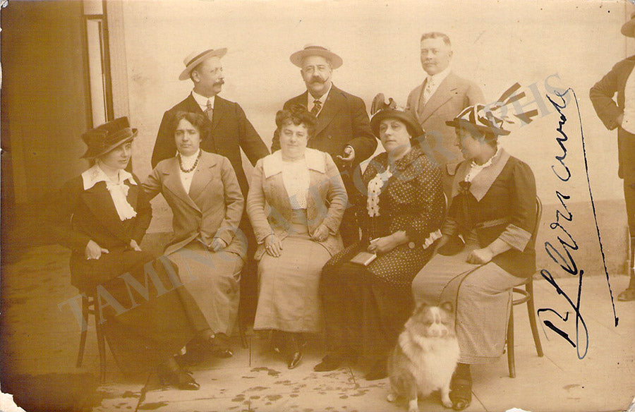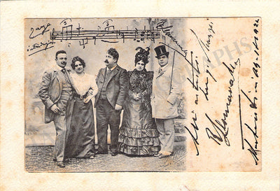 Fine black-and-white photo postcard of the composer shown in the center between the role creators of his opera Zazá (1900) Rosina Storchio, Mario Sammarco, Edoardo Garbin, and an unidentified woman; signed and inscribed by Leoncavallo vertically over the right side, dated in Montecatini, Italy, August 1912 (?).
