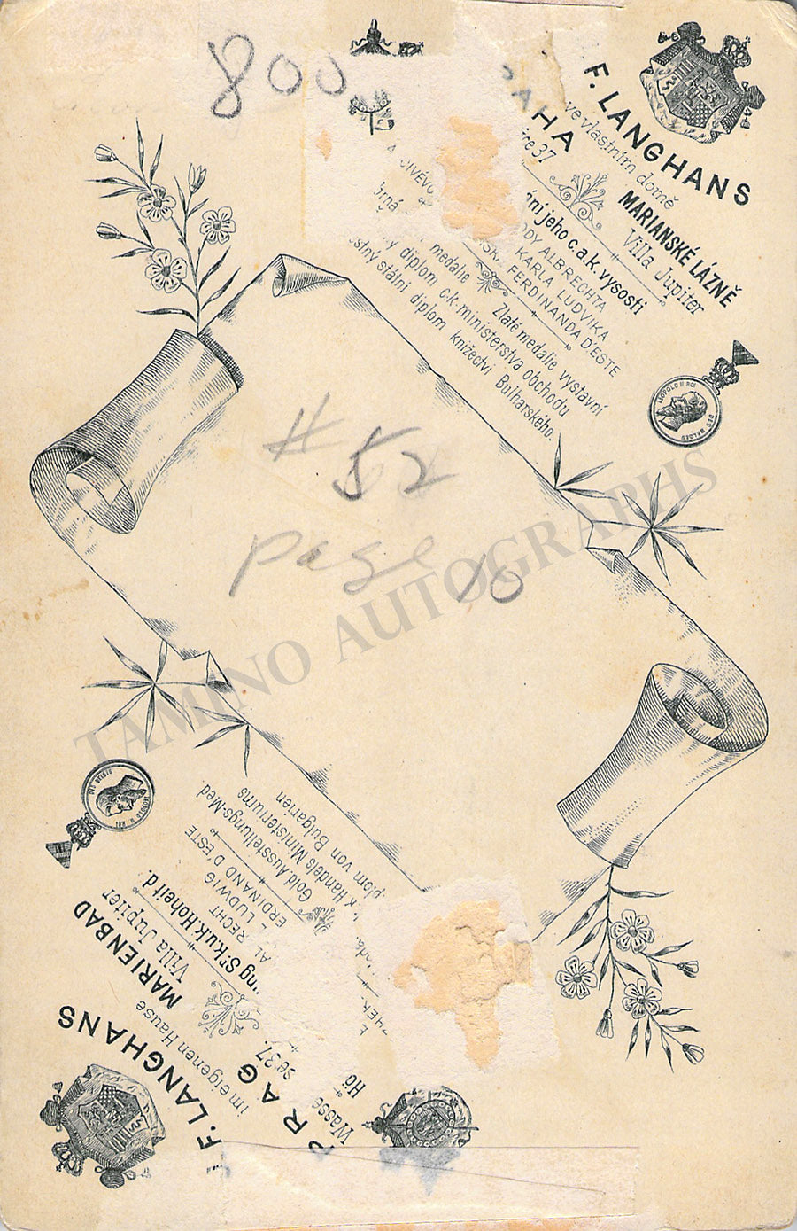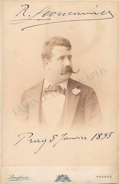 Beautiful cabinet photograph of the composer (an original by F. Langhans, Prague) signed by him in Prague, January 5, 1895. Size is 4.2 x 6.5 inches, gilded edges, minor damage on verso, otherwise in very good condition.