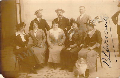 Signed sepia vintage photo postcard signed by him, shown among some of his friends and/or family. Size is 5.25 x 3.5 inches, minor loss of paper over the borders, in overall very good condition.