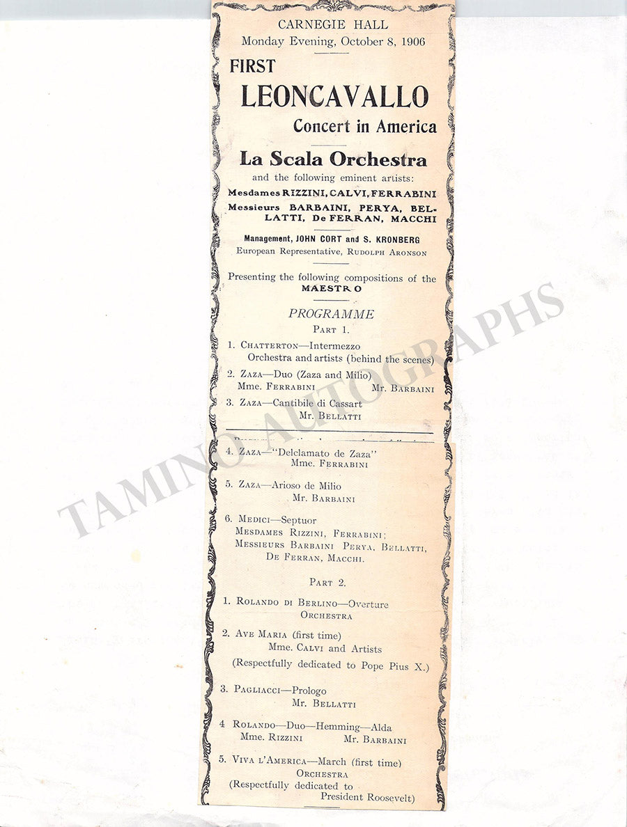 Program clip mounted on a page for a concert with Ruggero Leoncavallo at Carnegie Hall, New York, on October 8, 1906, conducting his own works Zazá, Pagliacci, and others.