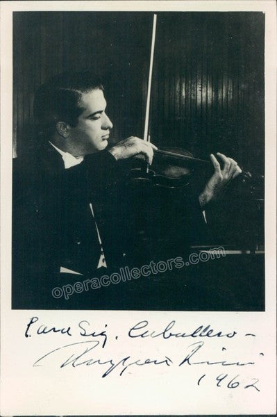 American-Italian violinist (b. 1918), well-known for his recordings and performances of the works of Paganini - he was the first to record the complete 24 caprices. Signed photo, shown in performance, inscribed, dated in 1962, stamped on verso by agent Conciertos Barbieri, size is 3.75 x 5.75 inches. In excellent condition