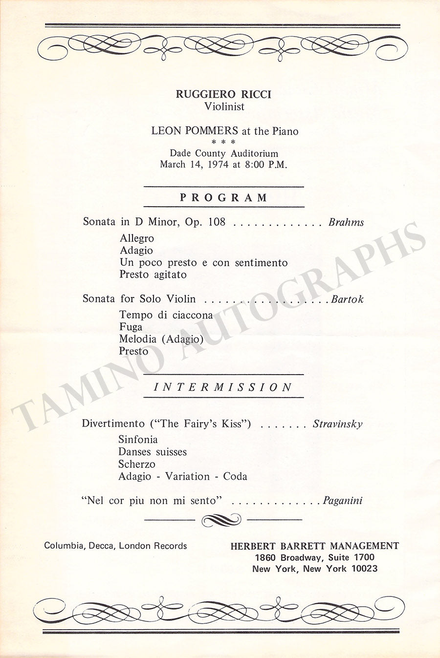 Signed program, 4 pages, Dade County Auditorium, Miami, Florida in March, 1974. Ricci plays music by Brahms, Bartok, Stravinsky, and Paganini. Size is 6 x 9 inches, small bends, otherwise in excellent condition.