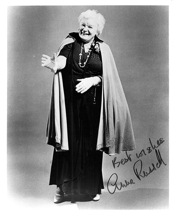 English–Canadian singer and comedian (1911-2006), known for her concert performances and famous recordings parodying works of Wagner and Gilbert and Sullivan. Large signed photo, shown as herself. Size is 8 x 10 inches, in excellent condition.