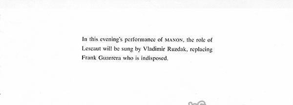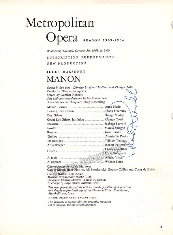 Croatian baritone (1922-1987), signed cast page of Massenet's Manon at the Metropolitan Opera, New York, dated in 1963. Size is 8 x 11 inches, small creases on far right of page, otherwise in excellent condition. Also included: 2.5 x 7 inch program insert noting Ruzdak's participation in the cast as a substitute for the originally scheduled baritone.