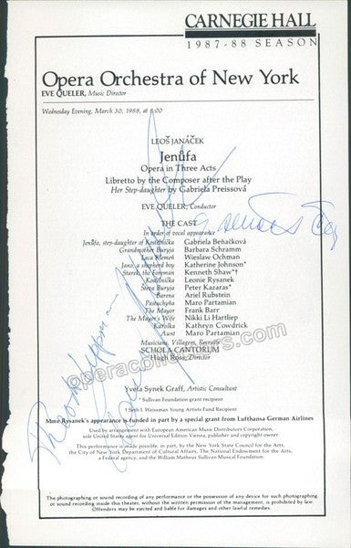 Jenufa at Carnegie Hall, 1988, cast page signed only