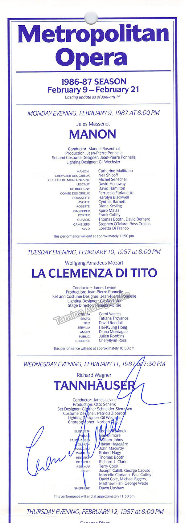 Legendary Austrian soprano (1926-1998), signed playbill announcing her February 11, 1987 performance at the Metropolitan Opera, New York in the role of Elisabeth in Wagner's Tannhauser with the signature on the cast list (this playbill also lists other operas being performed the same week with different casts, this is the only signature on the playbill). In excellent condition.
