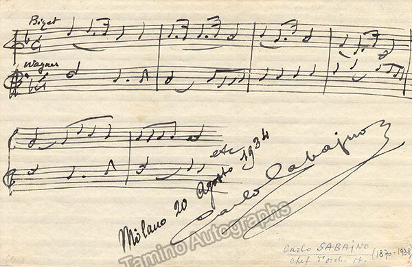 Autograph music quote with six bars of music by Bizet and Wagner, signed by him and dated in Milan, 1934.  Size is 5.8 x 3.75 inches, in excellent condition.
