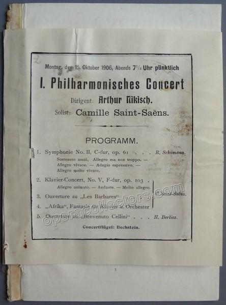 Camille Saint-Saens plays his own works, Arthur Nikisch conducts. Berlin 1906. 20,5 x 14,5 cm. Paperback. 14 pages. Berlin, Philharmonie, 15. Oktober 1906. Berliner Philharmonisches Orchester. Conductor: Arthur Nikisch. Camille Saint-Saens, piano. Schumann: Sinfonie 2, Saint-Saens: Klavierkonzert 5, Saint-Saens: Ouvertüre ‚¬žLes Barbares‚¬œ, Saint-Saens: Afrika, Berlioz: Ouvertüre ‚¬žBenvenuto Cellini‚¬œ