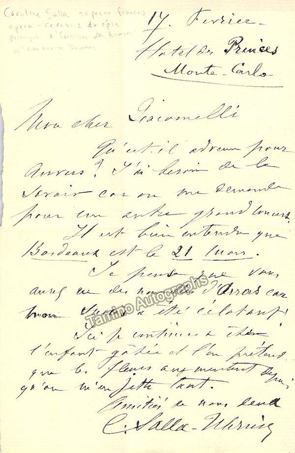 French soprano (1852-?),  born as Caroline de Septavaux, starred in the title role of Ambroise Thomas's Francoise da Rimini in the world premiere performances at the Paris Opera in 1882. Autograph letter signed, written in Monte Carlo. 1 page, written in French, sold untranslated. Size is 4.5 x 7 inches, in excellent condition.