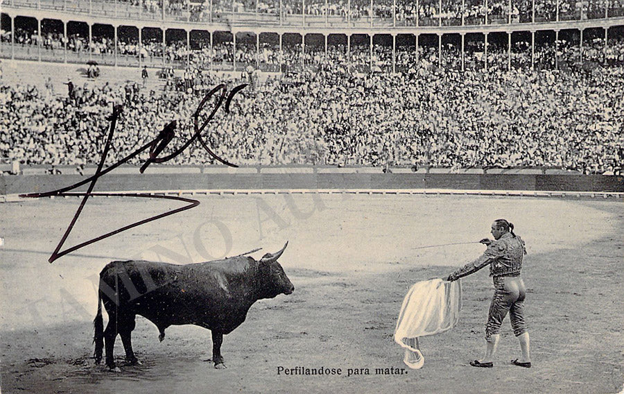 Beautiful postcard depicting bullfighting signed by the artist with a black felt tip pen. Size is 5.4 x 3.5 inches, in excellent condition.