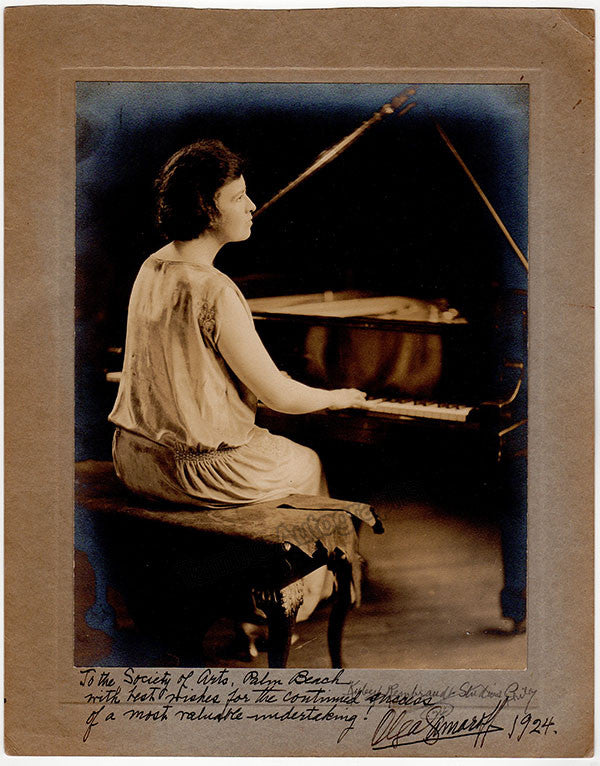 Large signed photo, dated in 1924, inscribed to the Society of Arts in Palm Beach. Photo is mounted on mat where she signed, total mat size is 9.5 x 12 inches. Photographer Kirsten Rembrandt also signed in pencil at the bottom. Some silvering around borders in the photo, otherwise in excellent condition.