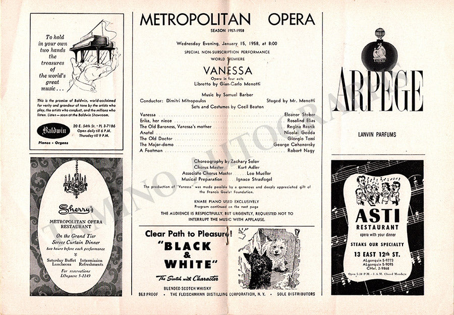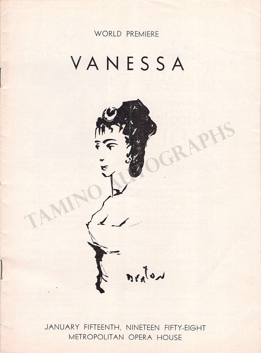 Program for the world premiere of Samuel Barber's "Vanessa" at The Metropolitan Opera House, New York, on January 15, 1958, starring Eleanor Steber.