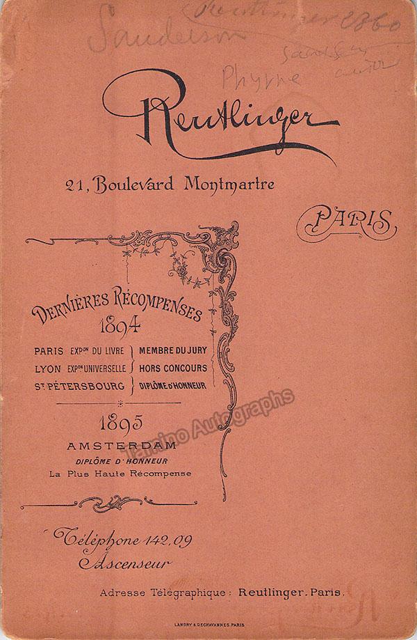 American soprano (1865-1903), unsigned cabinet photo, shown in the world premiere of Phryne in 1893, (opera by Saint-Saens). Size is 4.25 x 6.5 inches. Photo by Reutlinger, Paris, in excellent condition.