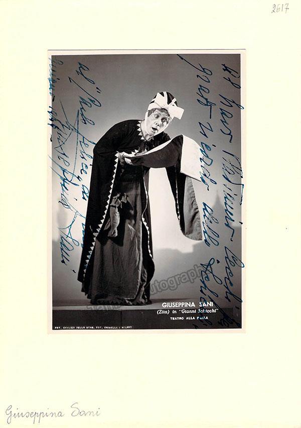 Italian mezzo-soprano (?-1985), signed photograph, shown as Zita in Puccini's Gianni Schicchi, inscribed in Milan and dated in 1949. Photo by Camuzzi, La Scala, Milan. This is a 4 x 6 inch postcard photograph mounted onto soft cardboard, total item size is 6.25 x 8.75 inches, in excellent condition.