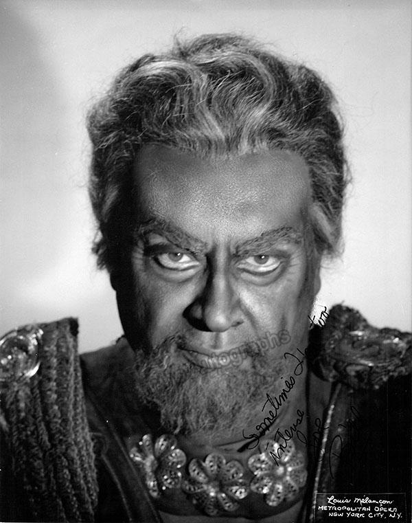 Large signed photo, shown as Amonasro in Verdi's Aida, inscribed. Stamped on verso by photographer Louis Melancon, Metropolitan Opera, New York. Size is 8 x 10 inches, in excellent condition.
