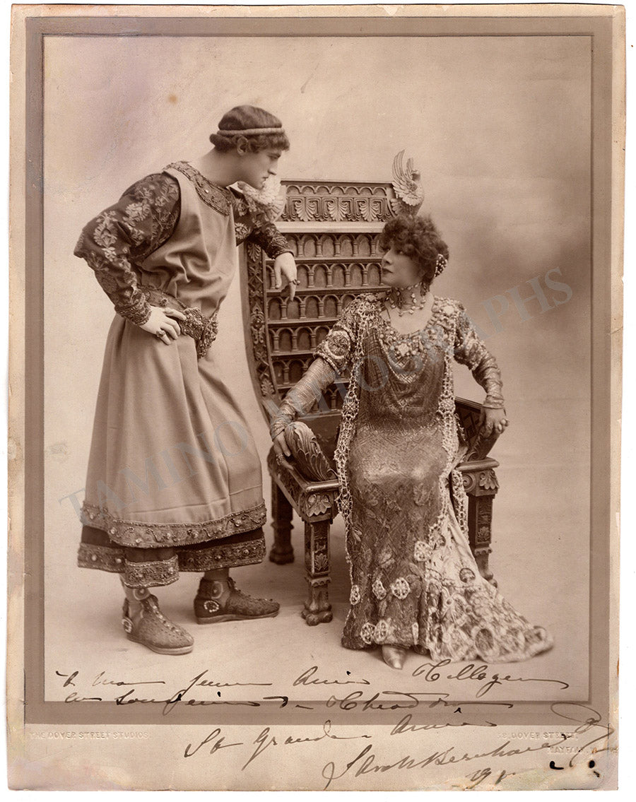 Original black-and-white photograph of the actress signed by her and inscribed with a short sentiment in French to the Dutch actor Lou Tellegen (who appears next to her in the photograph as Justinian in the play 'Theodora'), dated circa 1911 (date is partially erased); double blind-stamped on the front by The Dover Studios, London.
