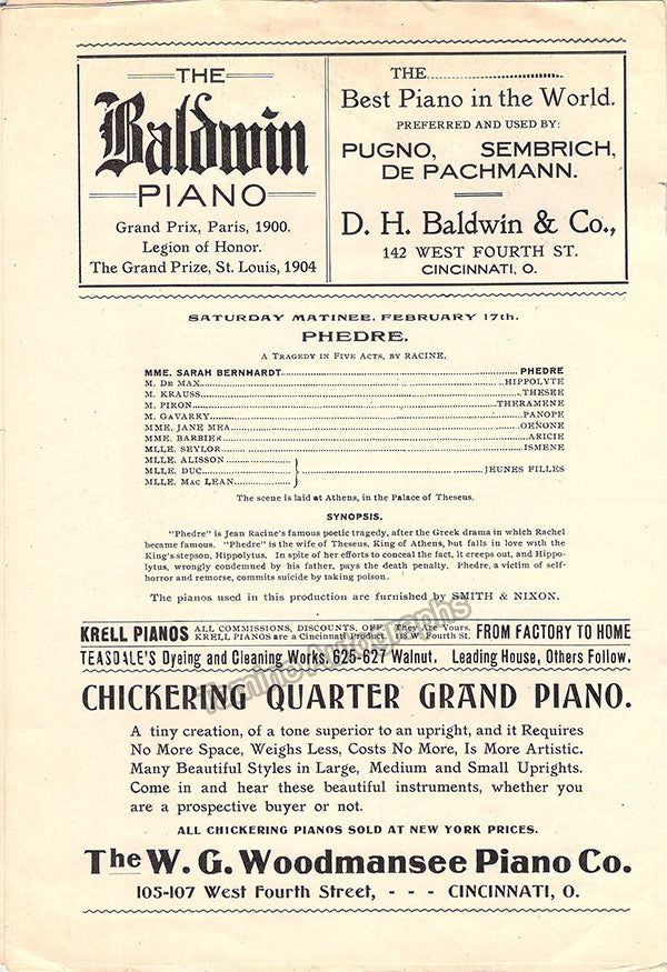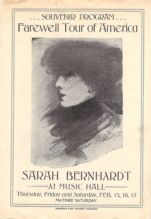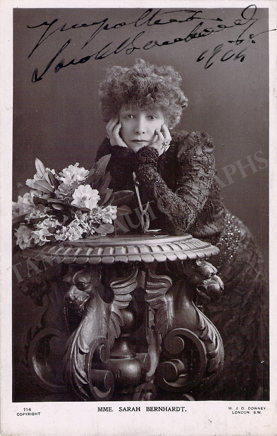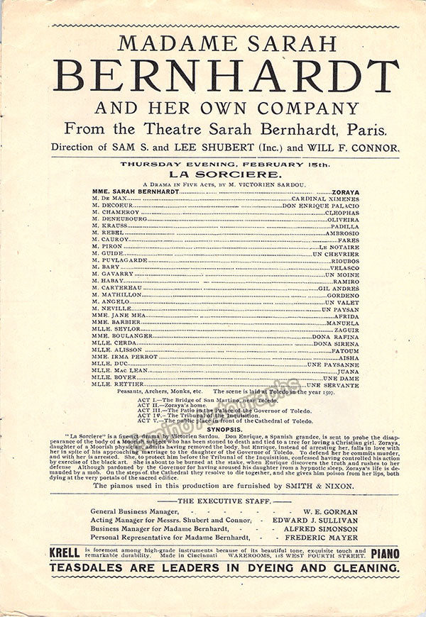 Bernhardt and Tellegen became lovers for four years, being Bernhardt 37 years her senior, during the second American tour of the celebrated actress. The sentiment translates as 'To my young friend Tellegen in remembrance of Theodora -his great friend Sarah Bernhardt'