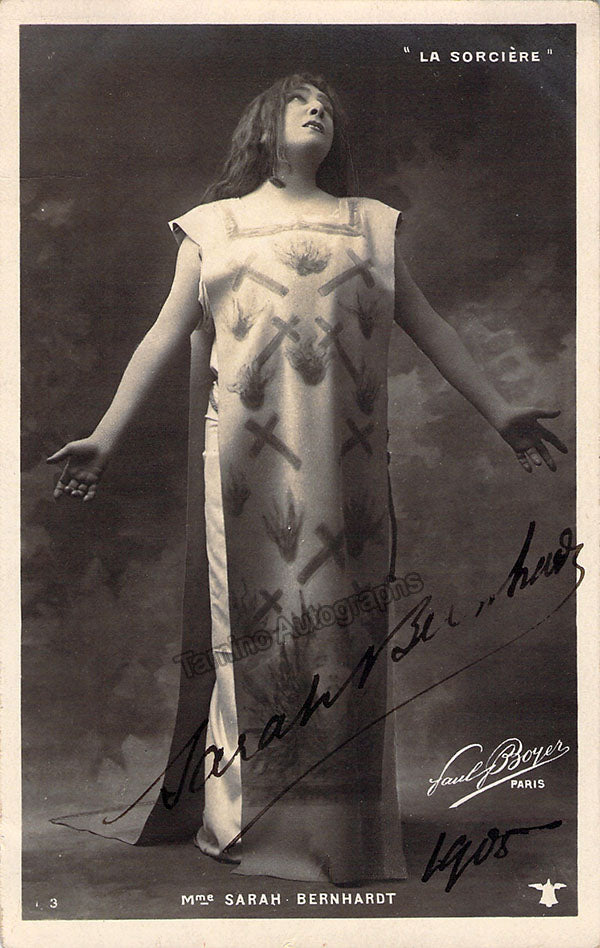 Beautiful black-and-white photo postcard signed by her in 1905, shown as Zoraya in Sardou's play La Sorciere; photo by Paul Boyer (Paris). Size is 3.5 x 5.5 inches, slight silvering, otherwise in very good condition.