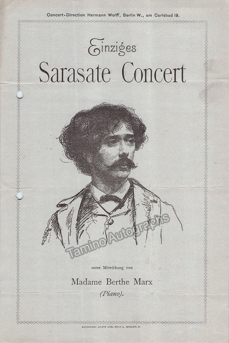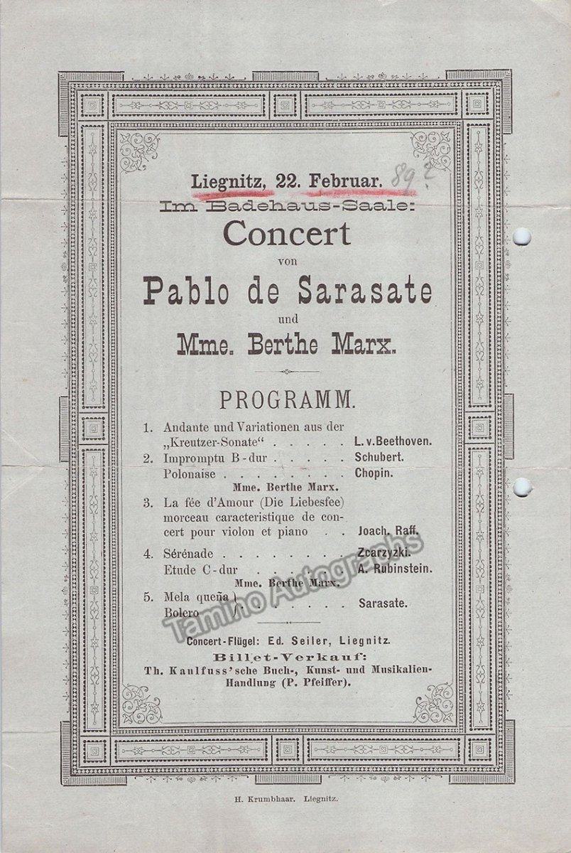 Program for a concert in Liegnitz, Germany at the Badehaus-Saal, February 22nd, 1889. Pablo de Sarasate, Violin performing with Berthe Marx, Piano. Beethoven: Aus der Kreutzer-Sonata. Schubert: Imromptu. Chopin: Polonaise. Raff: La fée d'Atour. Zcarzyzki: Serenade. Rubinstein: Etude. Sarasate: Mela quena + Bolero. Size is 6.25 x 9.25 inches, 1 page, on frontside a portrait of Sarasate, program is on the backside.