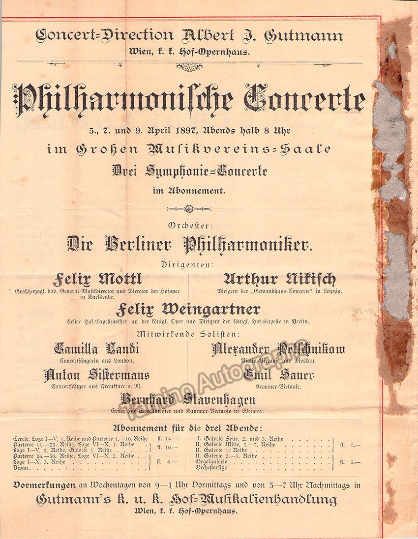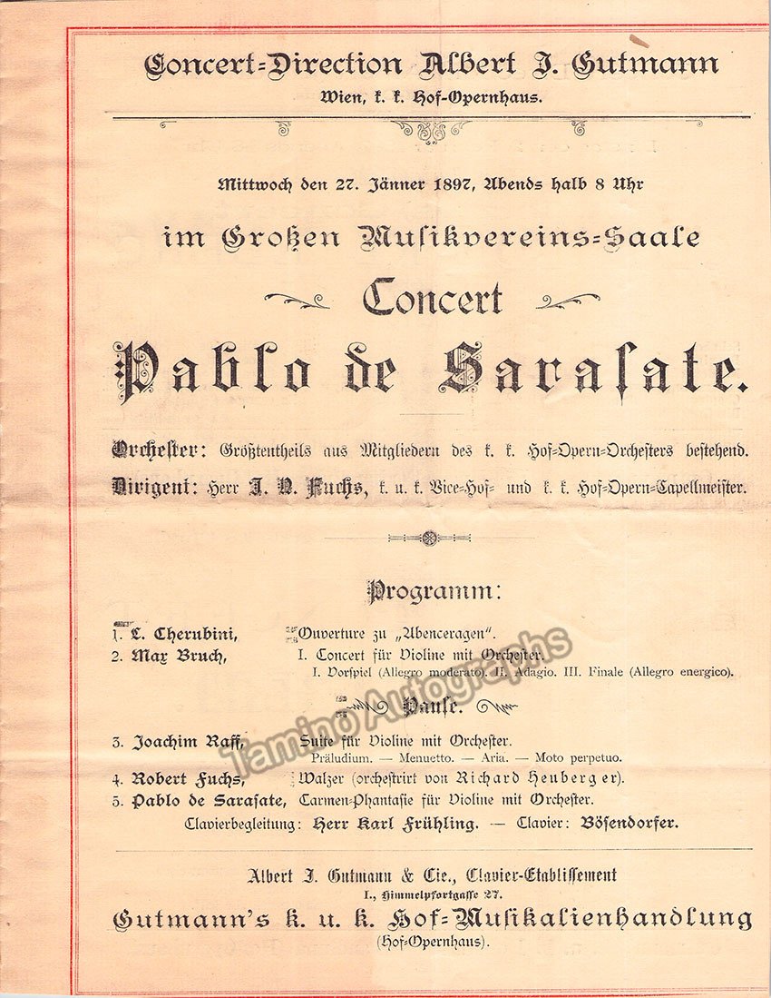 Concert at the Grosser Musikvereinssaal, Vienna, on January 27th, 1897 under the baton of J. N. Fuchs. Pablo de Sarasate, Violin, performing Cherubini: Ouvertüre ‚ - Abenceragen -. Bruch: Violin concerto. Raff: Suite for Violin and  Orchester. Fuchs: Walzer. Sarasate: Carmen-Phantasie. Inside as well full detailed programs of the following concerts by pianists Clotilde Kleeberg and Eugen d'Albert, on Febuary 2nd & 3rd, 1897 and announcements of concerts by the Böhmisches Streichquartett with Eugen d'Albert, Ferrucio Busoni,  Arthur Schnabel (14 years old!),  Alfred Grünfeld and others. Complete program, 4 pages, right and bottom borders are trimmed, mounting traces on page 4.
