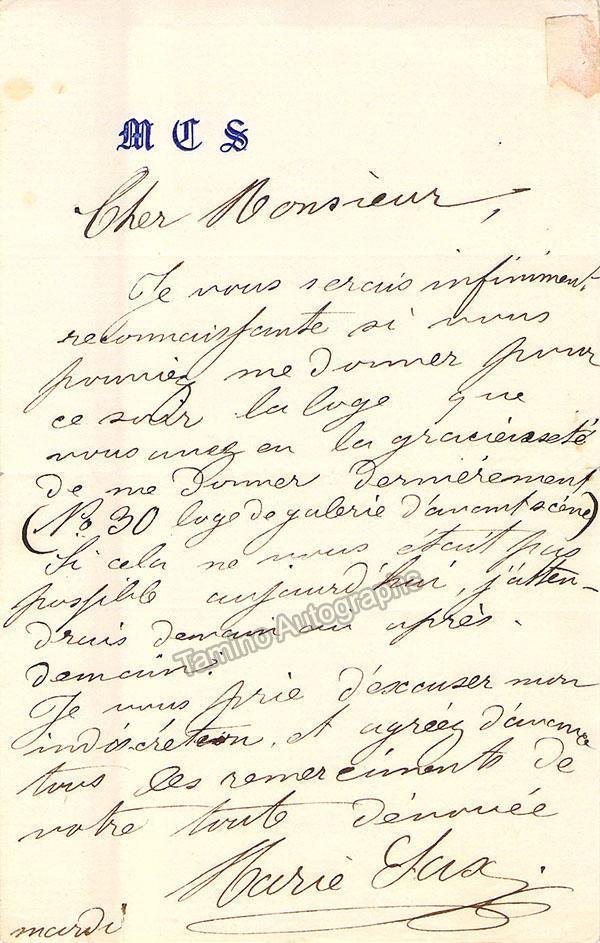 Belgian soprano (1834-1907), who performed in the French premiere of Tannhauser (1861), L’ Africaine (1865) and Don Carlo (1867). Autograph letter signed, one page embossed, written in French, sold untranslated. Size is 4.25 x 6.5 inches, some tape residue at top right, otherwise in excellent condition.