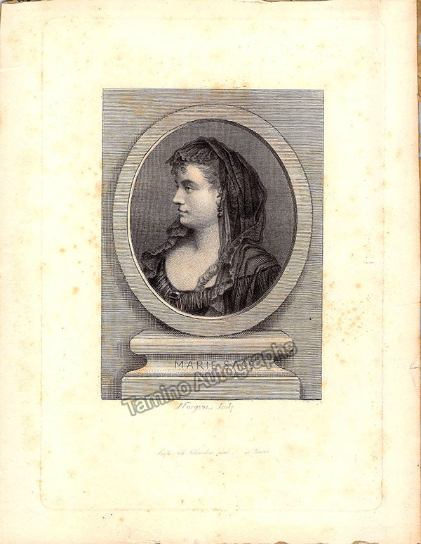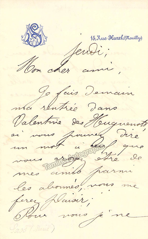 Autograph letter signed, embossed, composed in Neuilly, France, 2 pages, written in French, sold untranslated. Bold handwriting and signature. Size is 3.75 x 6 inches, in excellent condition. Also included: unsigned vintage print, shown in role, in a portrait. Size is 7 x 9 inches, slight rust but in otherwise good condition. Not sold separately.