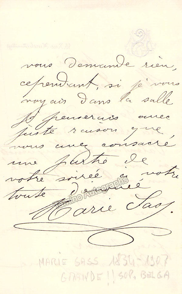 Belgian soprano (1834-1907) (whose name is also spelled as "Marie Sass"), who performed in the French premiere of Tannhauser (1861), L’ Africaine (1865) and Don Carlo (1867).