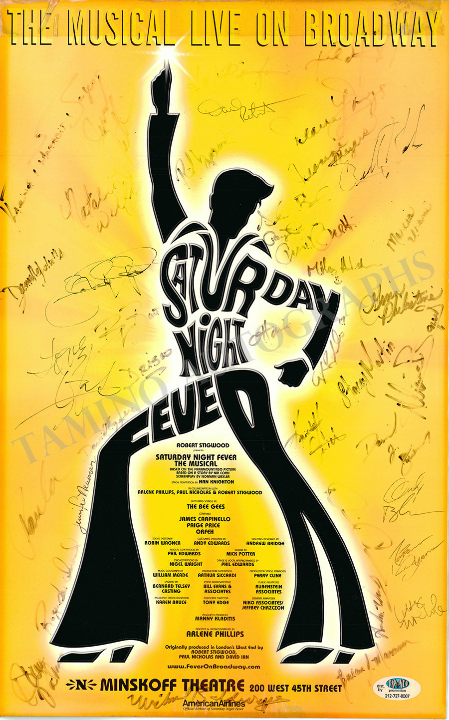 Original poster for a Broadway production of the musical Saturday Night Fever at Minskoff Theatre, signed by many members of the cast.