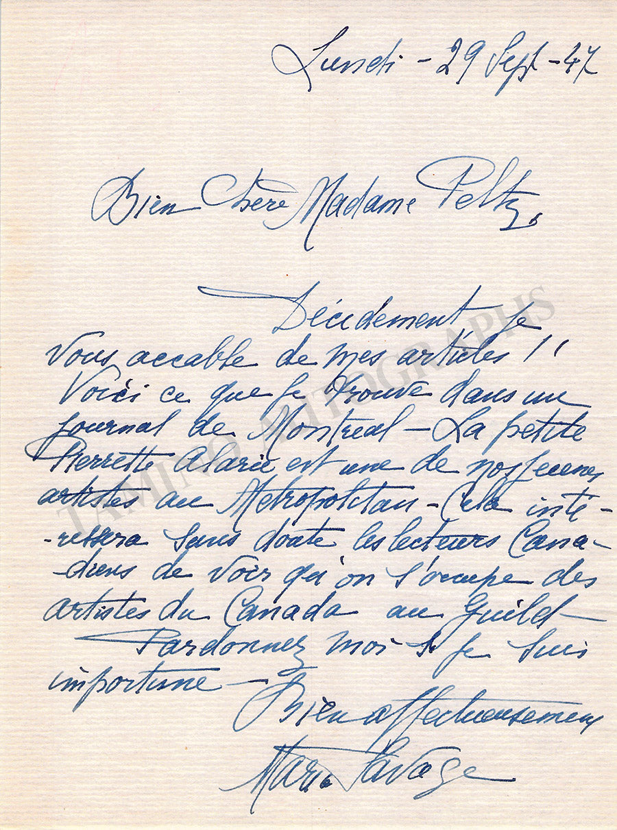 Belgian born American mezzo (1865-1957), known as "the grand lady of the chorus at the Metropolitan Opera House", sang in opera in both Europe and the United States for over sixty-three years. Autograph letter signed, dated in 1947, 1 page, written in French, sold untranslated. Size is 6 x 8.25 inches, in excellent condition.