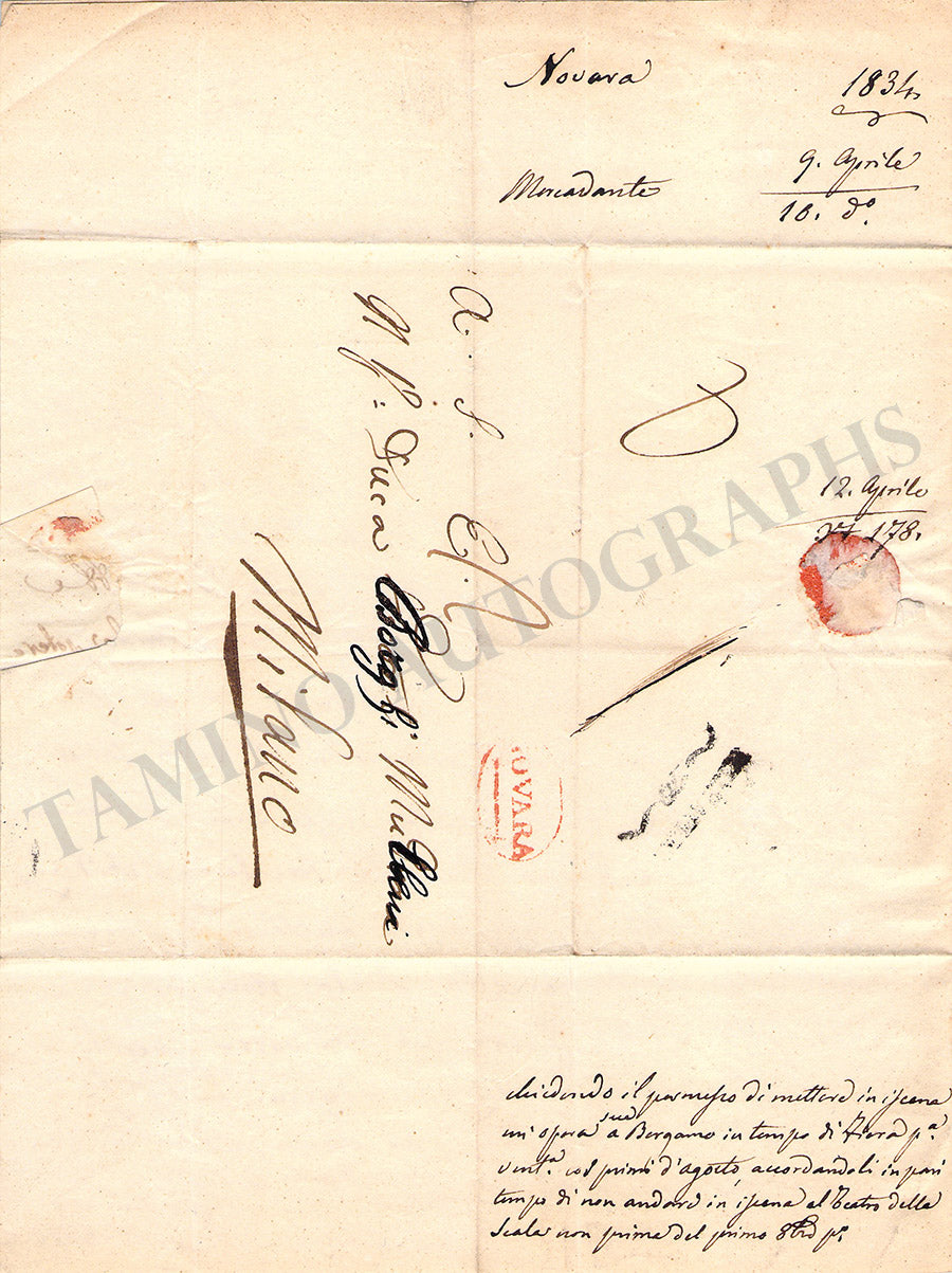 Autograph letter in Italian (sold untranslated) signed by him in Novara, 1834, about business matters. Size is 7.6 x 10.1 inches, 1 written page in 1 folded sheet, folds, in excellent condition.