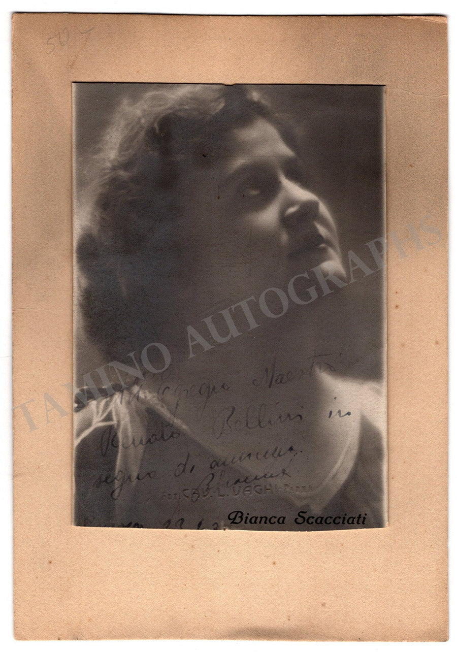Signed photo postcard, shown as herself, dated in 1939. Stamped on verso by photographer E. Romeo, Torino. Size is 4 x 6 inches, in excellent condition.