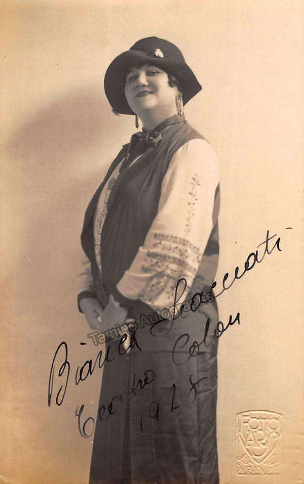 Italian soprano (1894-1948), signed photo postcard, shown as herself, dated in 1928, at Teatro Colon, Buenos Aires. Blind stamp on front by photographer Foto Ars, Florence. Size is 3.25 x 5.25 inches.