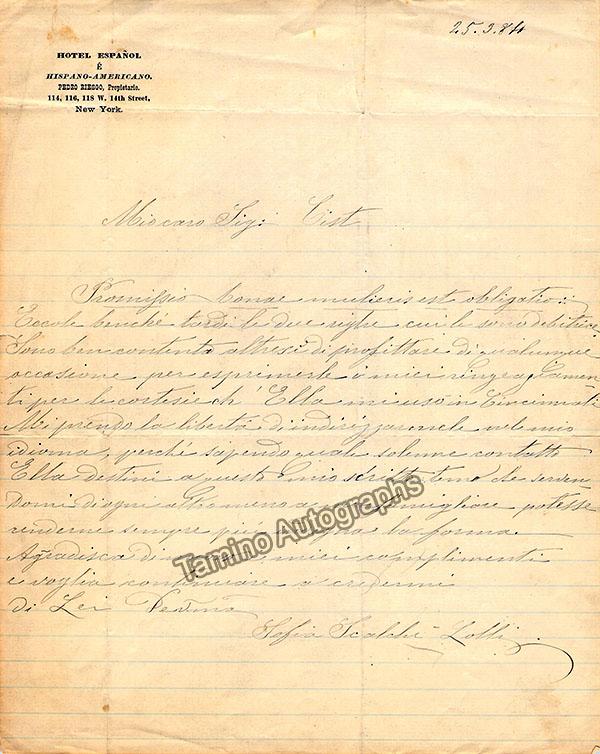 Autograph letter signed 1 page written in Italian on letterhead of the Hotel Espanol in New York, dated in 1884. Sold untranslated but with typed transcription on a separate page (see scan). Size of the original letter is 8 x 10 inches, in excellent condition.